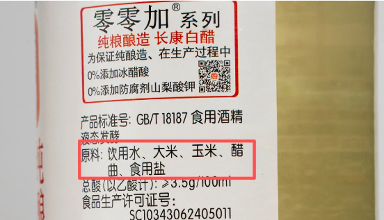 長(zhǎng)康純釀白醋,“零零加”系列,配料表干凈到讓人放心,只有水、大米、玉米、醋曲和食用鹽,0%添加冰醋酸,0%添加防腐劑山梨酸鉀,是真正的純糧釀造,不是配制醋。